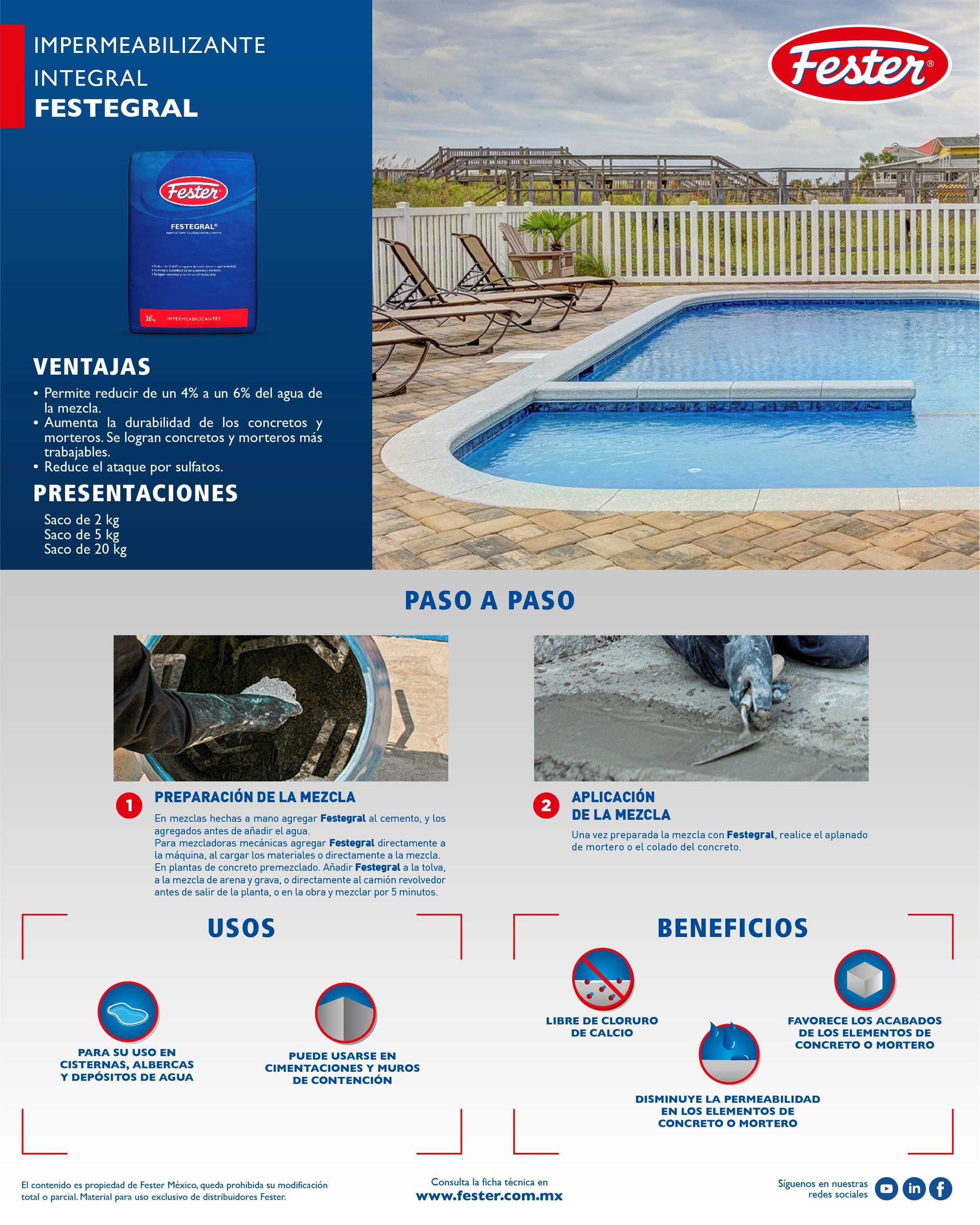 Impermeabilizante integral en polvo, contiene sales de ácidos grasos que favorecen la reducción de la permeabilidad en concretos y morteros, sin disminuir la resistencia a la compresión.